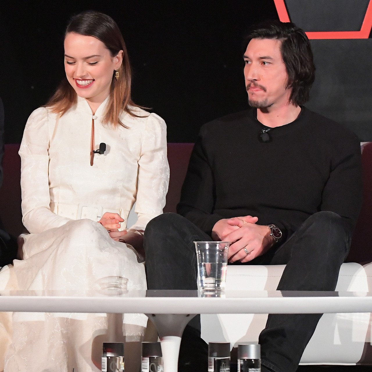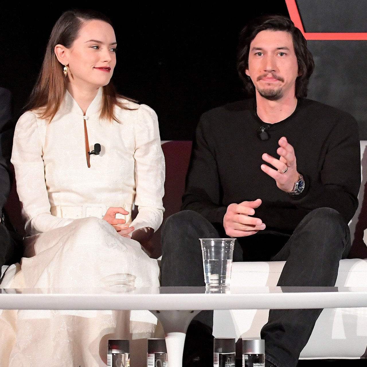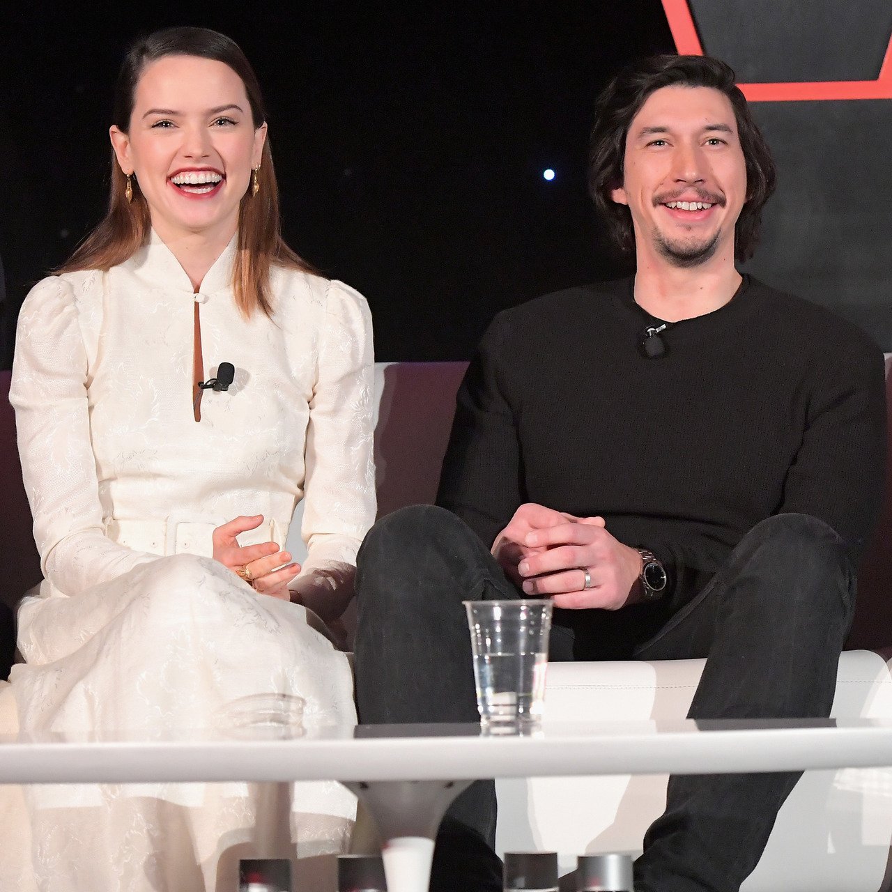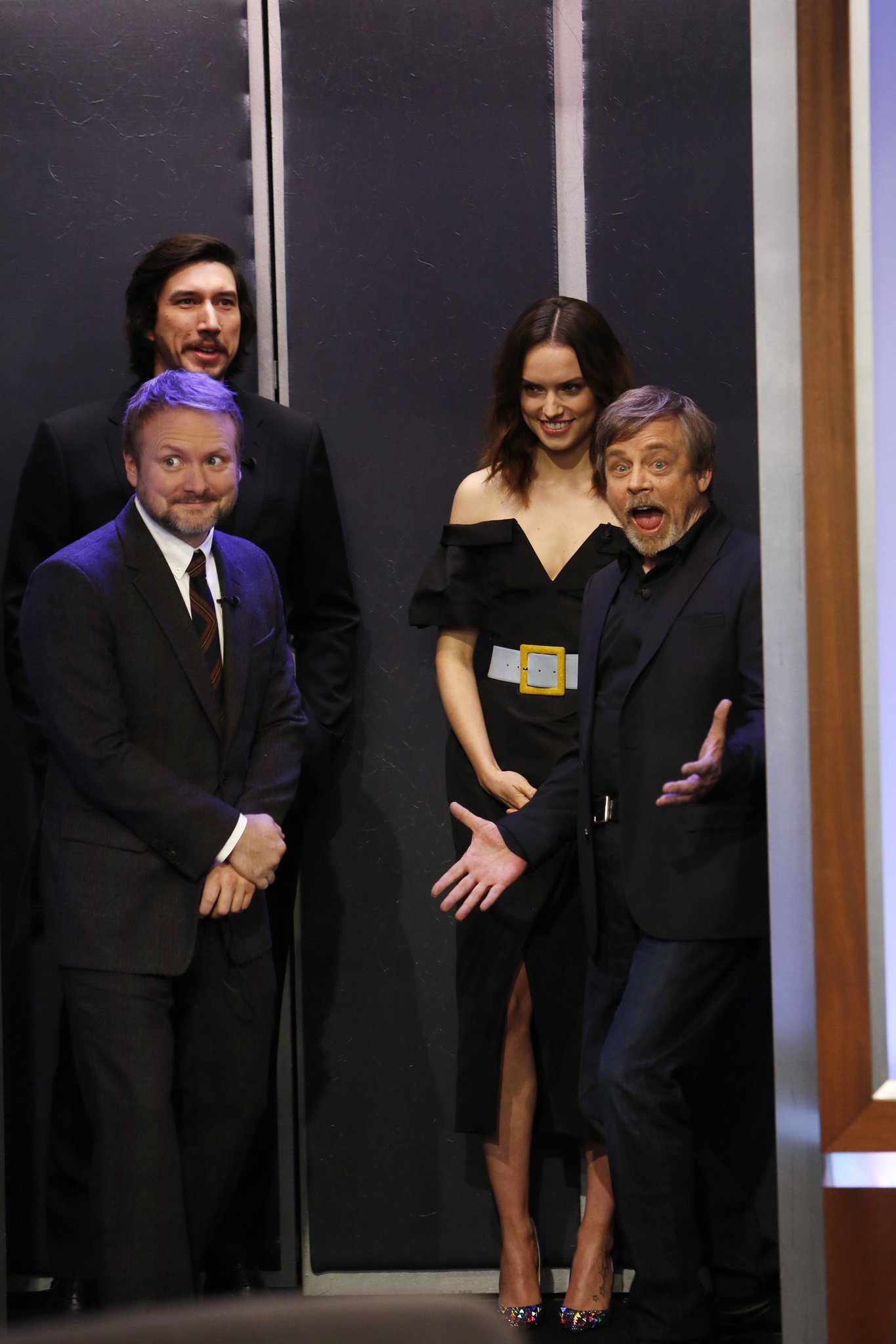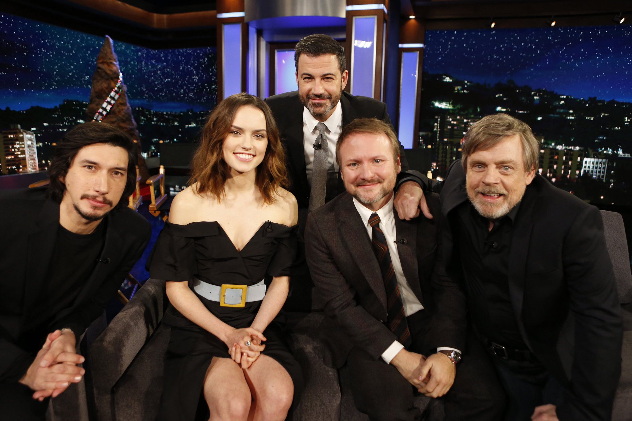 Daisy with co-star and "Bestie" Adam Driver (Kylo Ren/Ben Solo), Mark Hamill (Luke Skywalker) and Rian Johnson at Jimmy Kimmel Live! with Jimmy Kimmel.