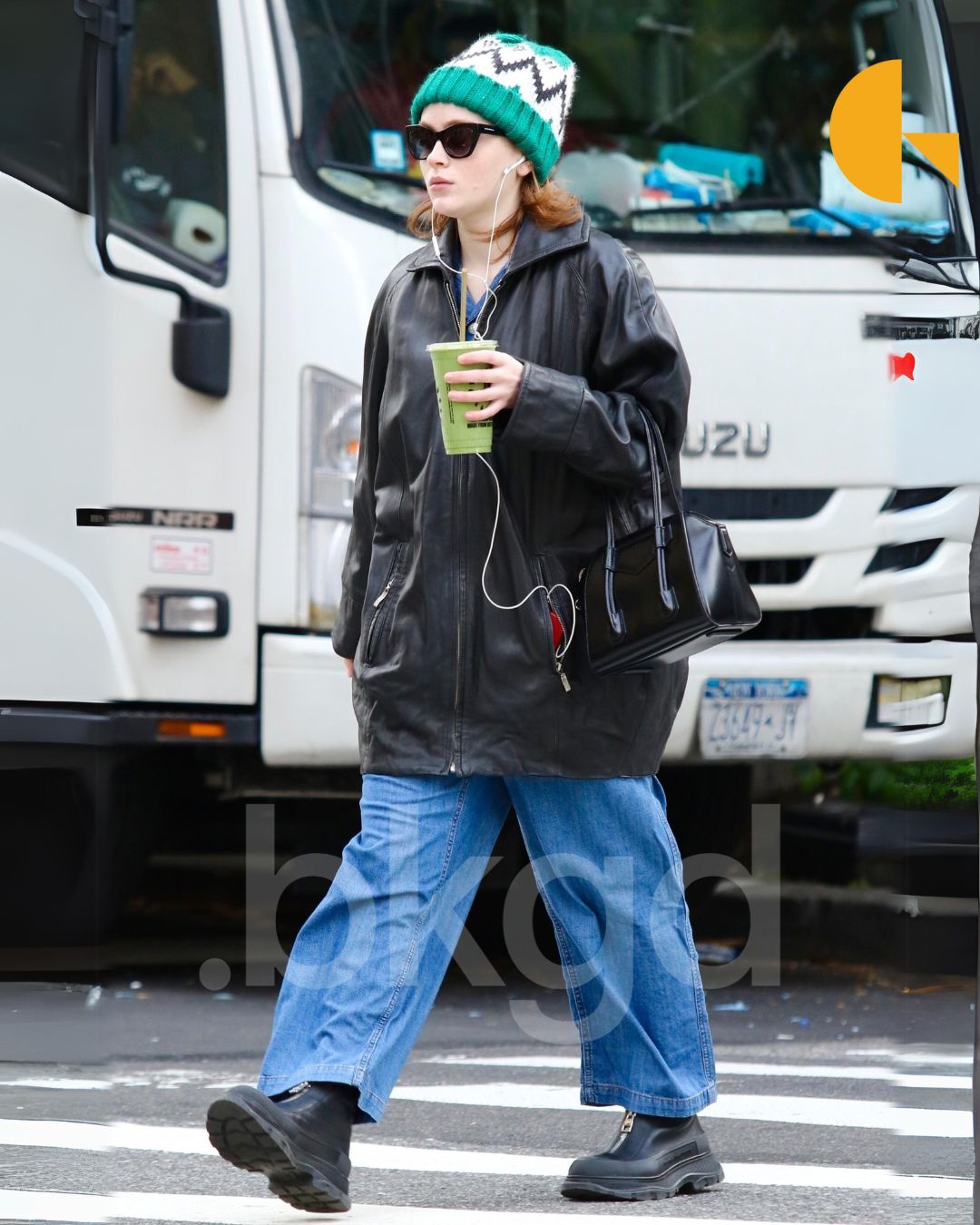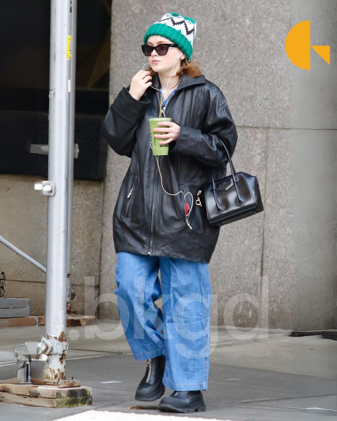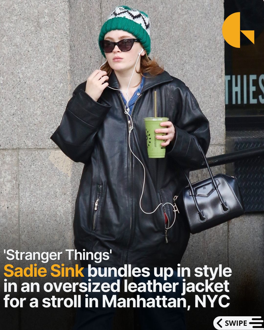Actress Sadie Sink was spotted braving the chilly New York City weather in an oversized leather jacket and a stylish wool hat.